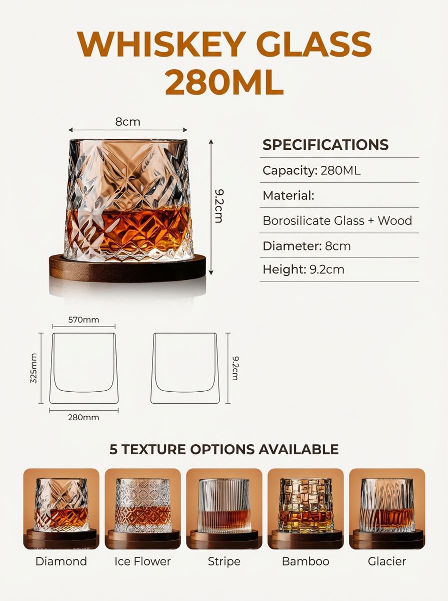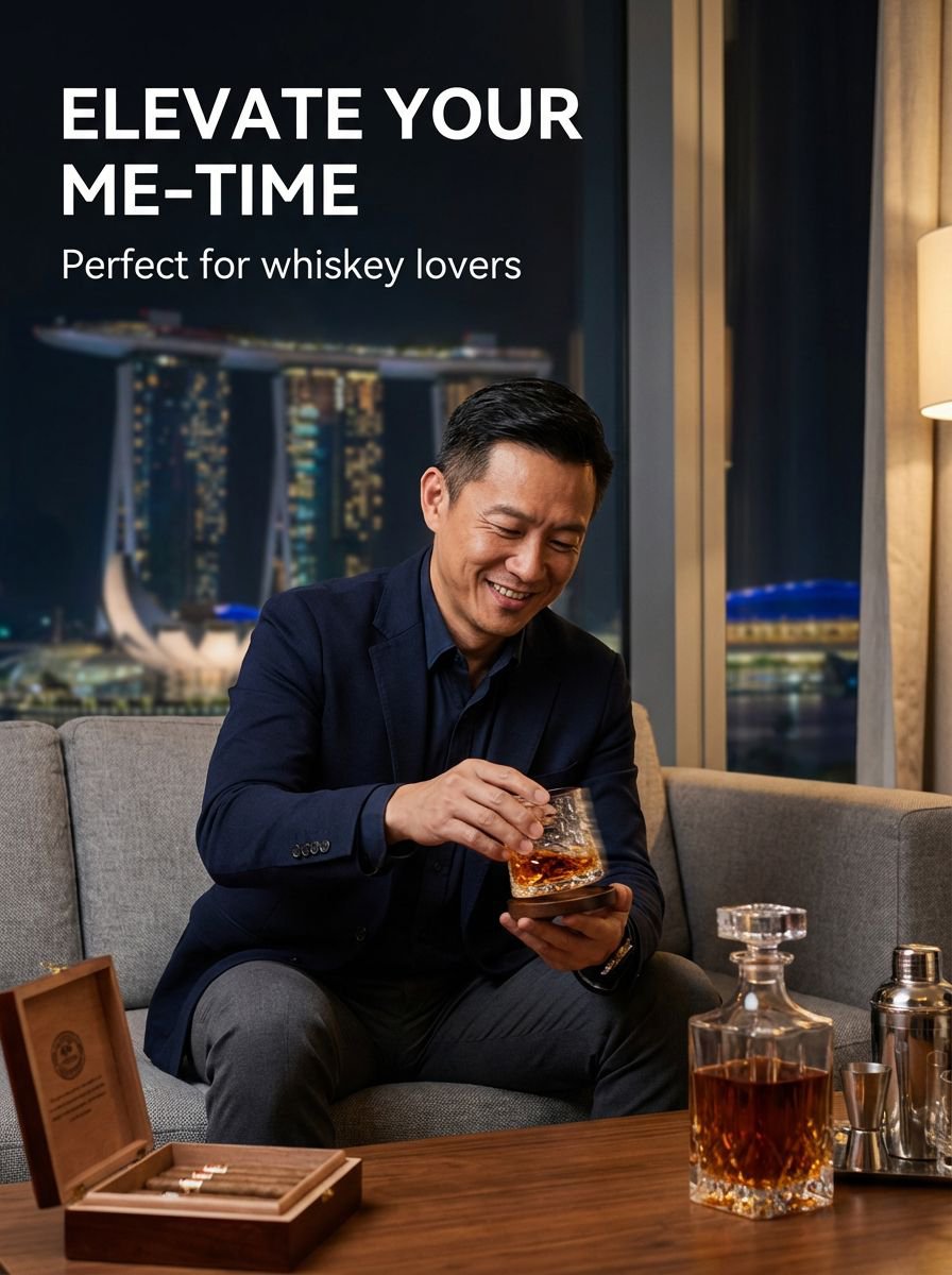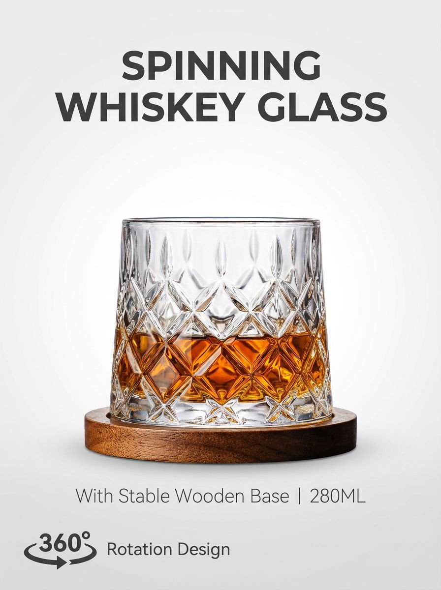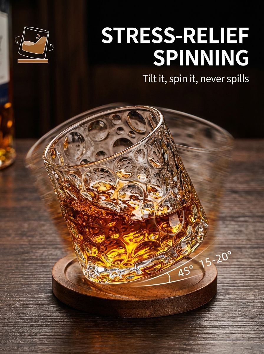 ● Unique rotating base design allows for gentle swirling, enhancing the aroma and flavor of whiskey, brandy, or water while providing a fun decompression experience.